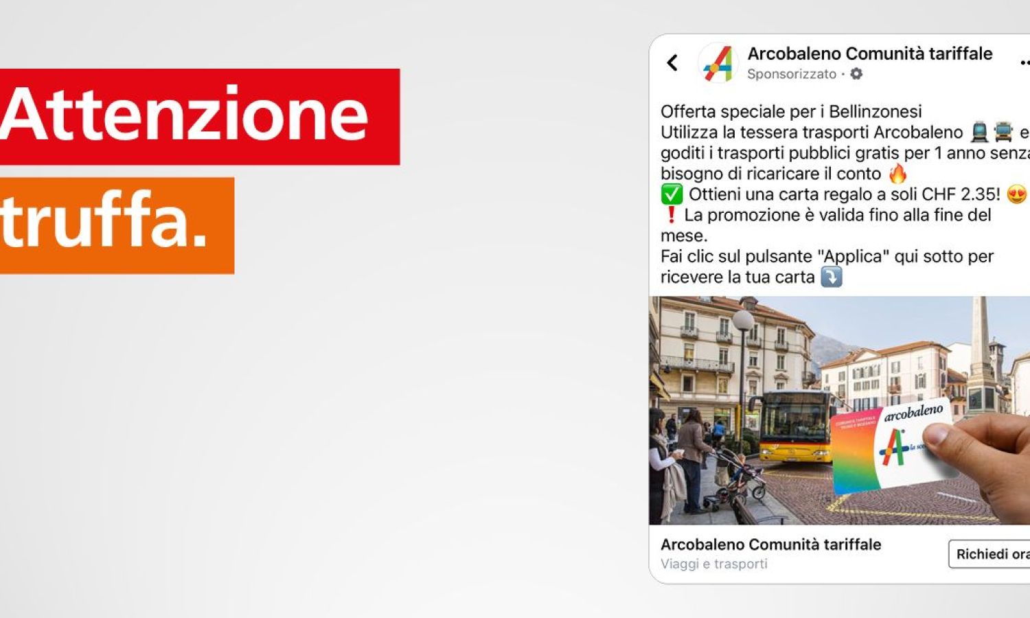 Le FFS hanno già reso attenti a questo problema. Sono attivi dei truffatori che inviano e-mail di phishing o che fanno circolare promozioni a pagamento sui social media che sembrano essere di Arcobaleno o delle FFS. Cliccando sulle promozioni e fornendo di seguito i propri dati delle carte di credito, si dà loro la possibilità di prelevare denaro. In altri casi gli autori infettano invece con dei virus i computer o gli smartphone di coloro che cliccano sui banner promozionali.