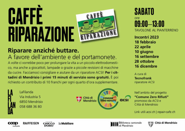 Anche nel 2023 verranno organizzati diversi Caffè riparazione alla Filanda di Mendrisio nell’ambito del progetto Comune Zero Rifiuti promosso da ACSI e Città di Mendrisio.