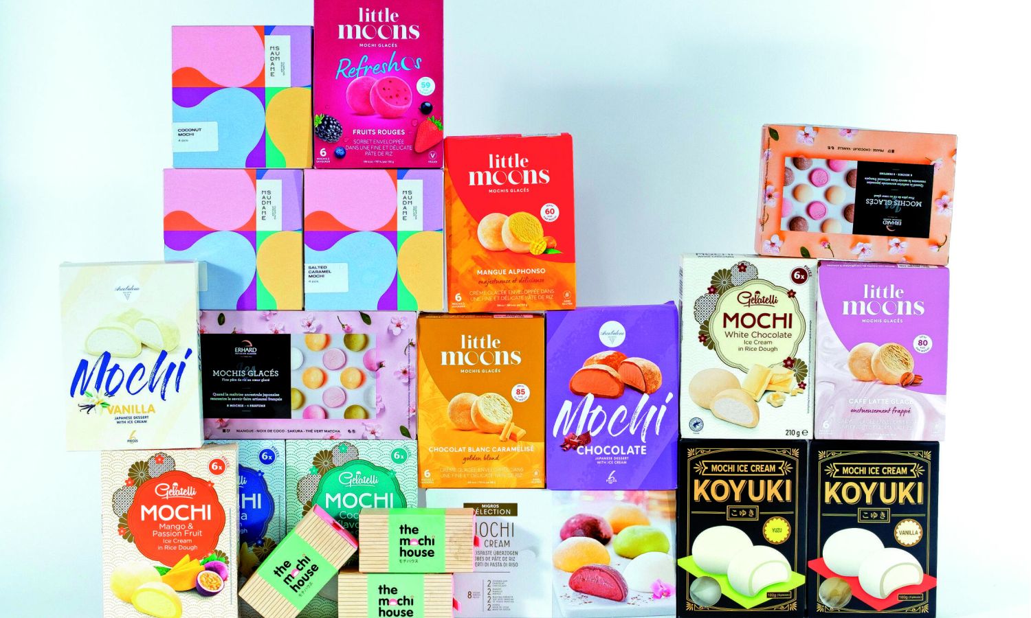 L’assortimento di dessert si amplia con specialità che provengono da lontano. Il Mochi, un gelato ricoperto di pasta di riso appiccicoso, occupa un posto importante nei grandi magazzini e nei cinema. Si dice che questa specialità abbia origine dal Giappone, ma non è proprio così. In realtà, il mochi è un’interpretazione occidentale congelata di torte giapponesi ripiene di purea di frutta o fagioli rossi, chiamate daifuku.