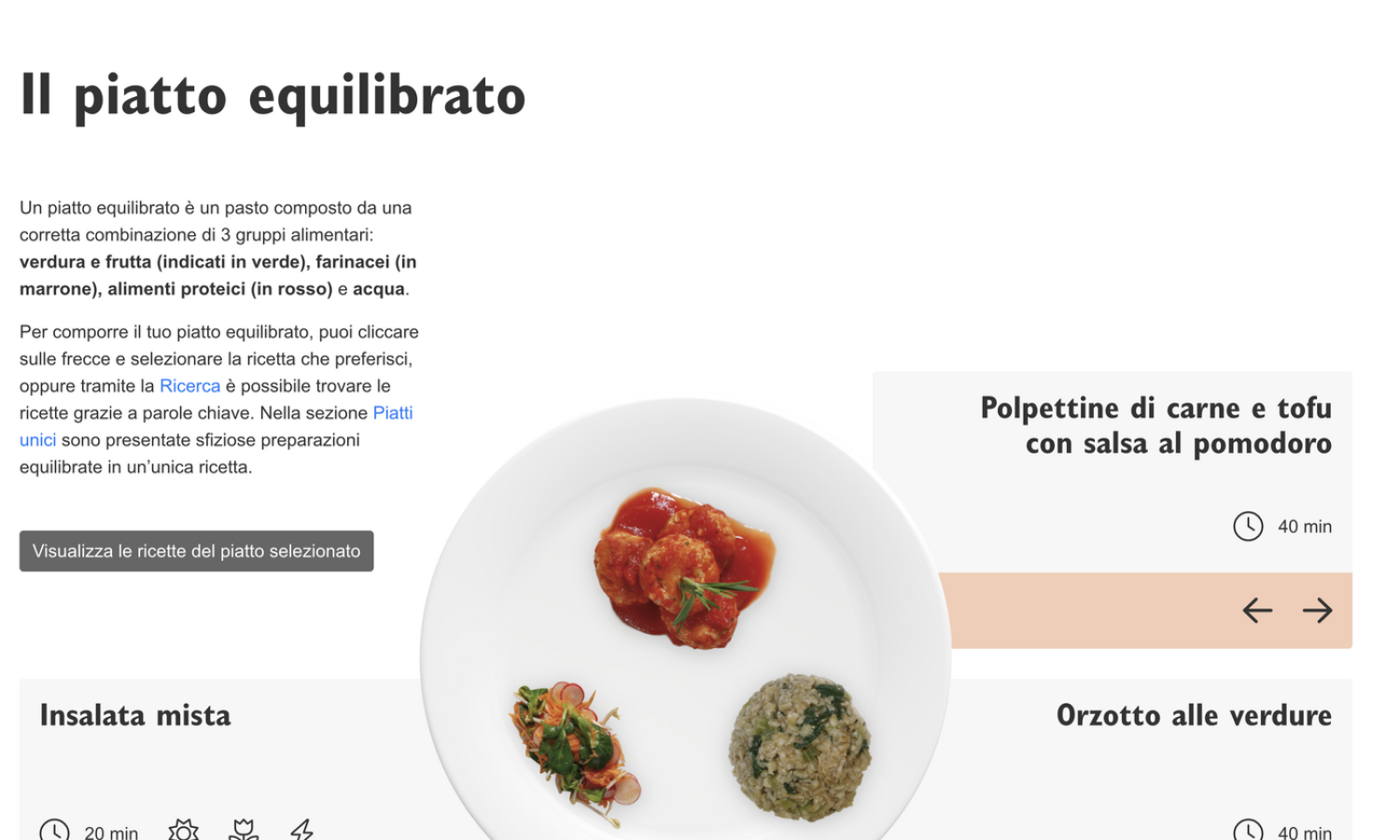 È un nuovo sito con ricette che rispettano i principi dell’alimentazione equilibrata. Con questo strumento interattivo è possibile creare più di 24’000 piatti equilibrati selezionando le ricette dei 3 gruppi alimentari che lo compongono: (1) una porzione di verdura/frutta, (2) un farinaceo (patate, riso, pasta, pane, altri cereali) e (3) un alimento ricco in proteine (carne, pesce, uova, legumi, tofu o latticini). La selezione delle ricette è facilitata dai filtri quali stagionalità, ingredienti, tempo di preparazione, ecc. Sul sito sono disponibili anche un’ampia scelta di piatti unici, diversi esempi di menu giornalieri equilibrati di stagione (colazione, pranzo, spuntini, cena) e una sezione dedicata agli approfondimenti, con risposte a varie domande e astuzie per mangiare equilibrato e variato.
