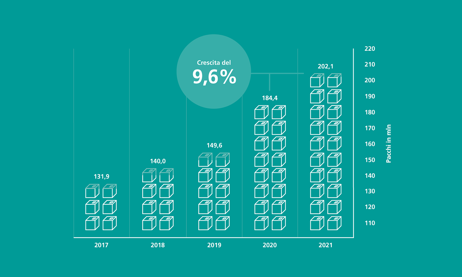 Nel 2021 per la prima volta il numero di pacchi ha superato quota 200 milioni, attestandosi a 202,1 milioni. Un andamento che mette in luce la tendenza di un numero sempre crescente di consumatori di effettuare acquisti online. Rispetto al 2020, i 202,1 milioni di pacchi spediti nel 2021 rappresentano un aumento del 9,6%. Rispetto al 2019, l’aumento è del 35%. La pandemia ha dunque accelerato la crescita del commercio online in Svizzera.