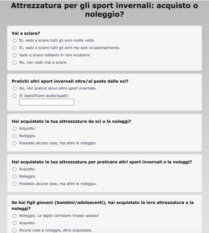 Sorpresa: il 39,4% di chi ha risposto non va a sciare e la maggior parte di questi non pratica alcun altro tipo di sport invernale (56,7%). Il 42% circa dei partecipanti pratica lo sci regolarmente od occasionalmente tutti gli anni. Di tutti questi, tra “patiti” dello sci e praticanti occasionali, la gran parte acquista la propria attrezzatura (68%), il 21% possiede alcune cose e altre le noleggia, il restante (11%) noleggia l’attrezzatura che gli serve. Il quadro è simile per chi pratica (anche o solo) altri sport invernali: 61% acquista l’attrezzatura, il 14% la noleggia e il restante 25% noleggia ciò che non possiede già.